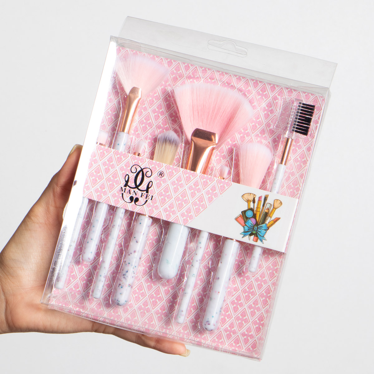 Contiene 4 brochas para ojos y 4 para rostro. Tiene un pelo suave, su presentación es hermosa. Viene en bolsa X12 UND