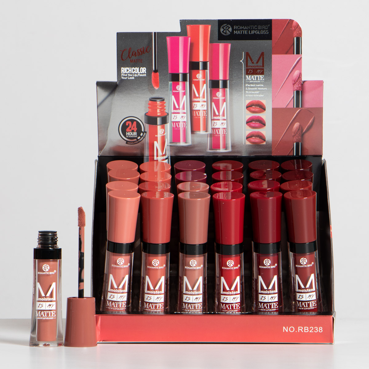 No maltrata ni reseca los labios, es matte. Humecta, suaviza y es de larga duración. Huele delicioso. Viene en 12 tonos y el display es X24 UND.