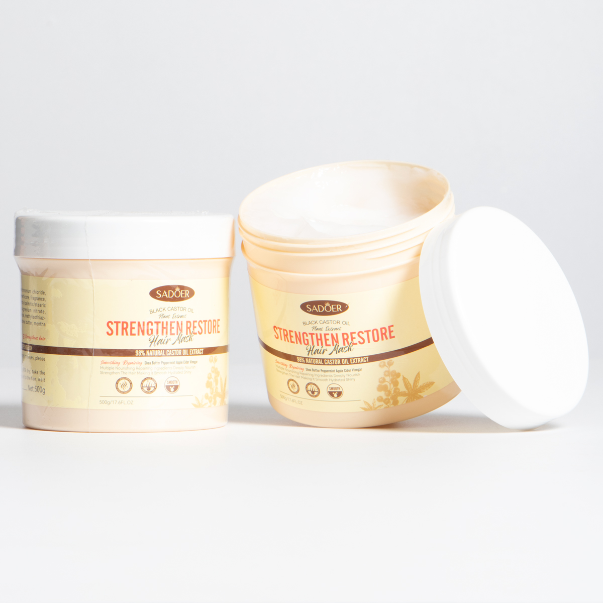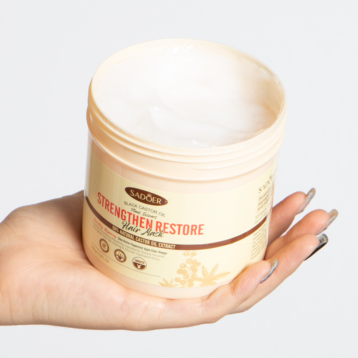 Esta mascarilla con extractos de aceite de ricino, nutre profundamente tu cabello, hidrata dejandolo suave y brillante. Huele delicioso. Aplicar despues del shampoo y dejar actuar de 5 a 10 minutos y enjuagar con abundante agua.