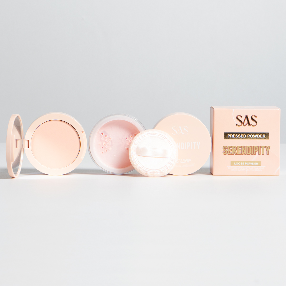 El polvo suelto rosado funciona para iluminar, neutralizar ojeras oscuras y sellar el maquillaje con un efecto aterciopelado. Es ideal para todo tono de piel y el polvo compacto normal tiene mayor cobertura, aporta color, es más denso y es ideal para retoques rápidos durante el día. Tiene su pomito y su propio espejo. Viene en display X12 UND