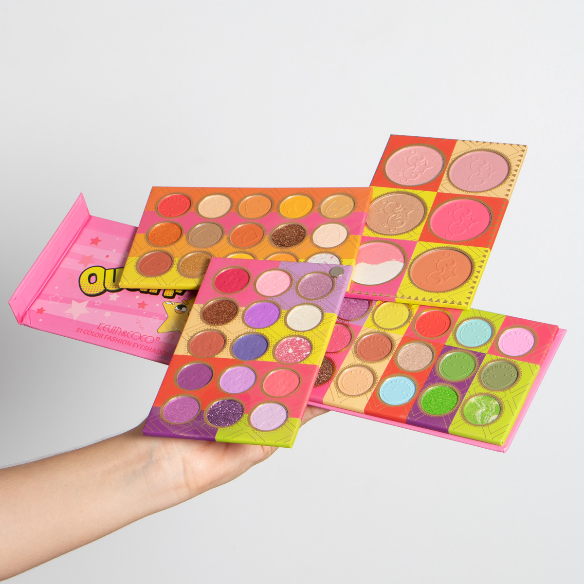 Contiene 45 colores de sombras distribuidos entre matte, satinados y glitter, tambien 3 rubores y 3 iluminadores. Es de alta pigmentacion. Viene en caja X12UND.