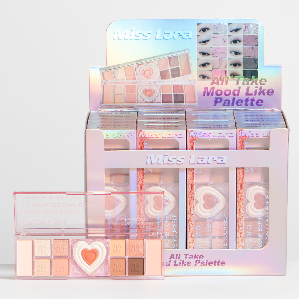 Contiene 10 colores de sombras distribuidos entre matte y satinados, 1 rubor y 1 iluminador. Es de alta pigmentacion. Viene en 2 tonos y display X24UND.