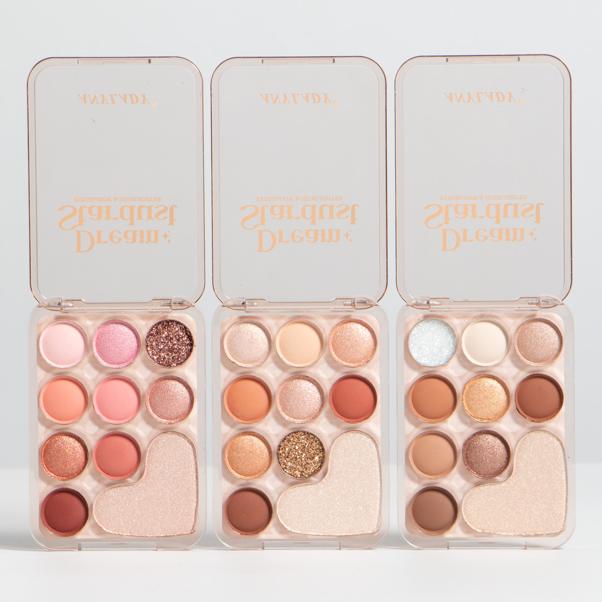 Contiene 9 colores de sombras distribuidos entre matte, satinados y glitter. Adicional trae un iluminador. Es de alta pigmentacion. Viene en 3 tonos y display X24 UND.