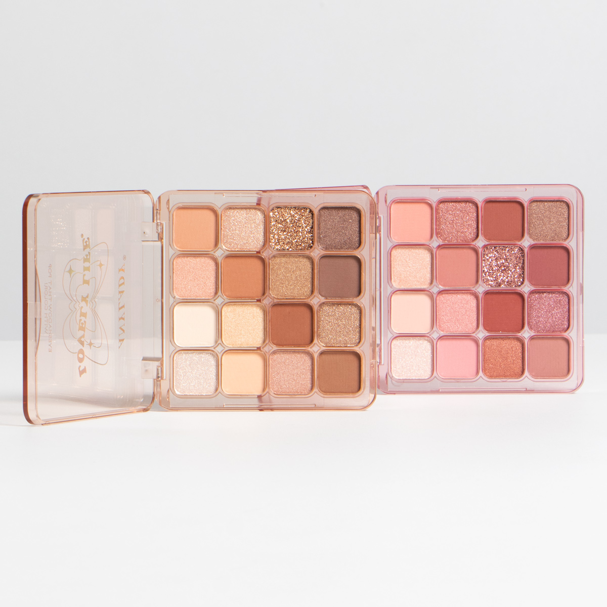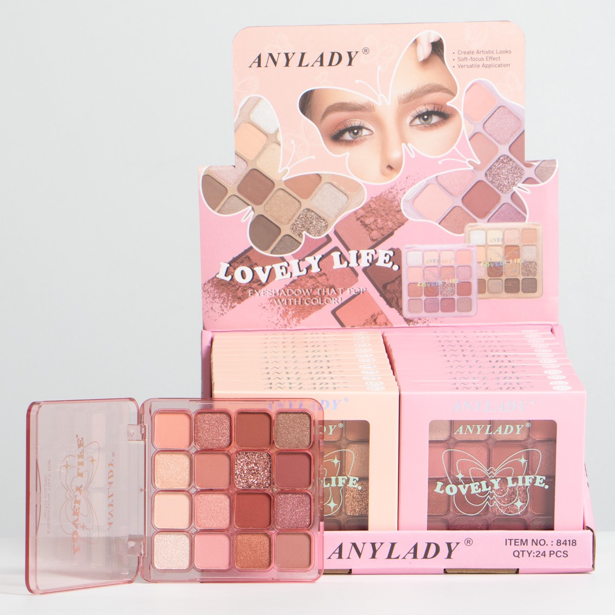 Contiene 16 colores de sombras distribuidos entre matte, satinados y glitter. Es de alta pigmentacion. Viene en 2 tonos y display X24 UND.