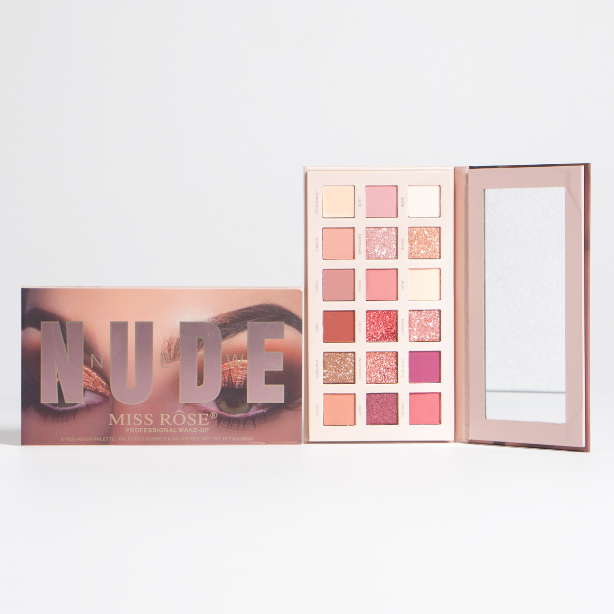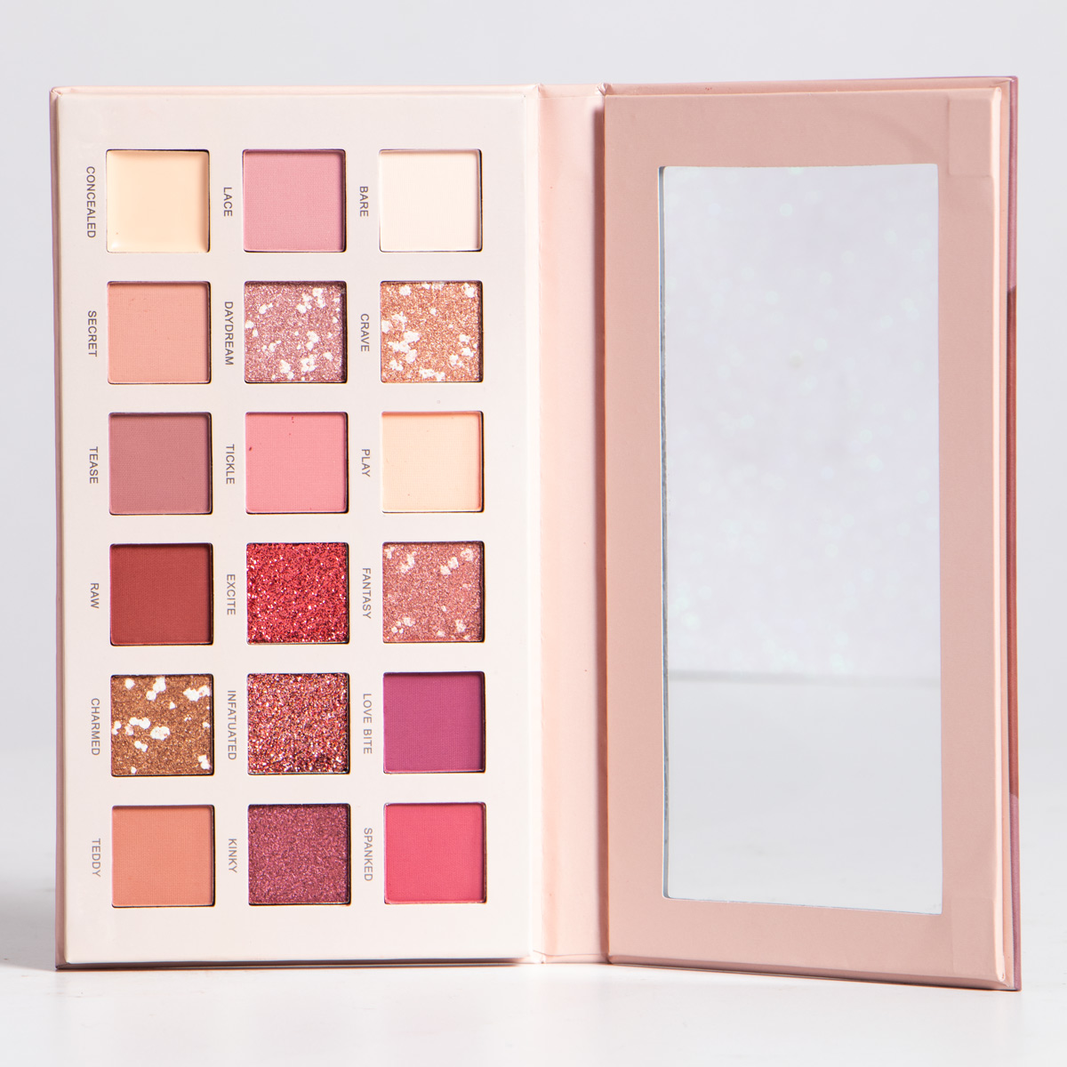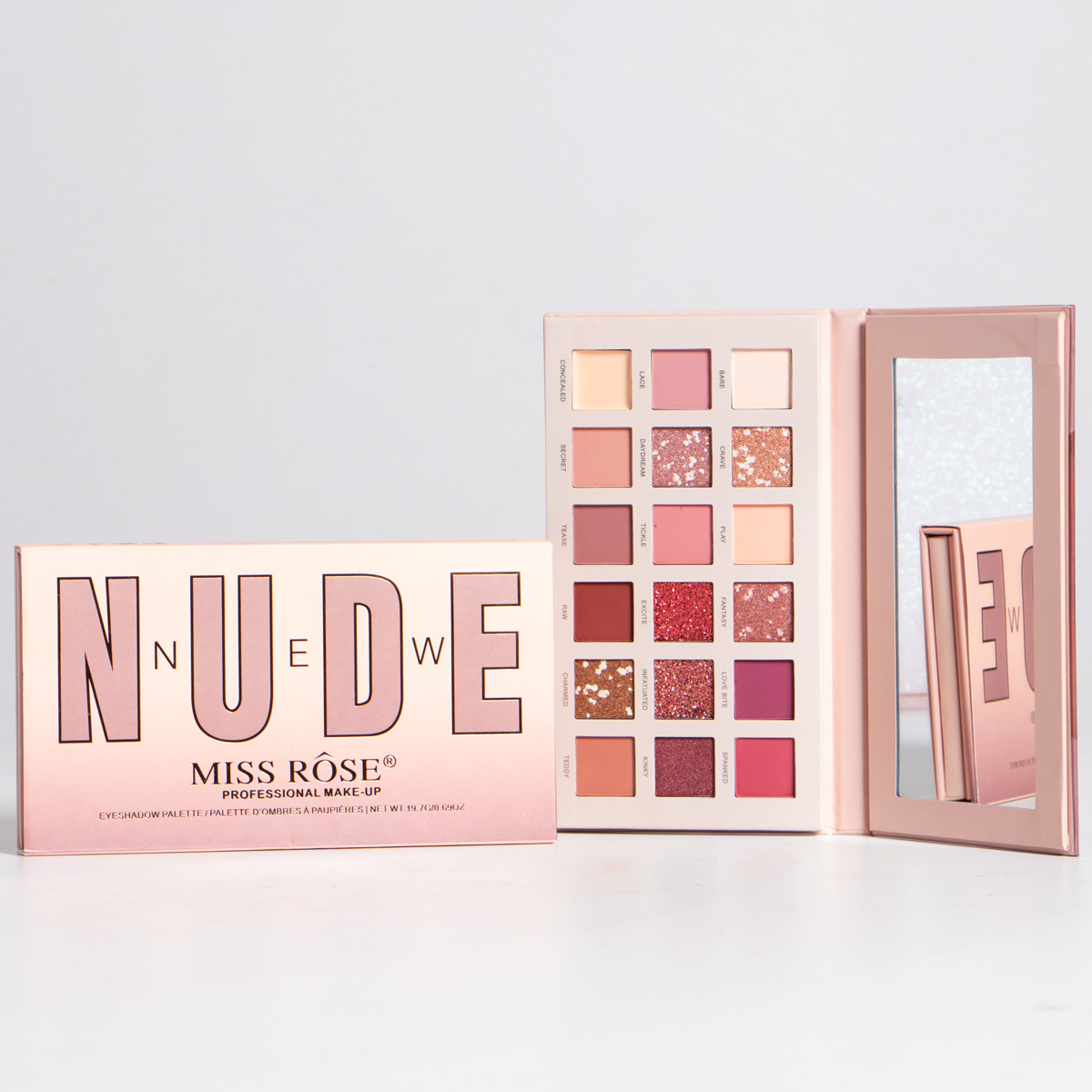 Contiene 18 colores de sombras distribuidos entre mates, satinados y glitter, ademas trae un corrector y su propio espejo. Es de alta pigmentacion.